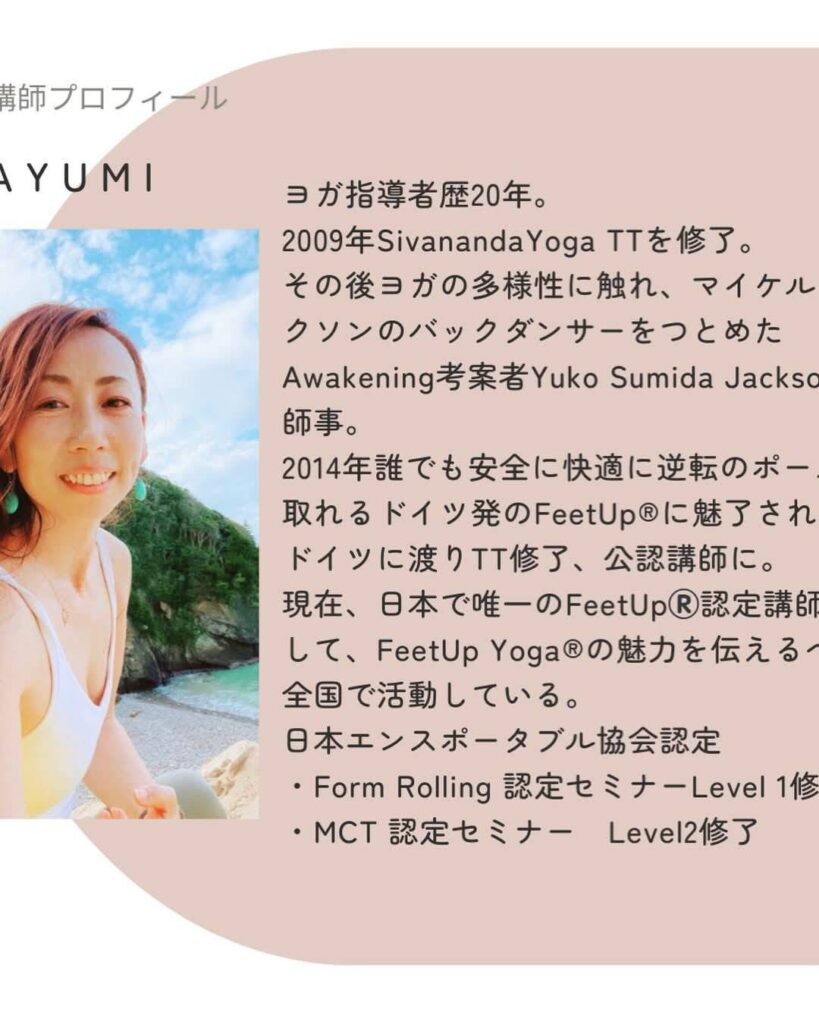 日本で唯一のFeetUp Yoga®︎認定講師のAyumi先生は湘南在住のため、岡山BASEでクラスを受けられるのはかなり貴重な機会となりますこで、このチャンスをお見逃しなく☆