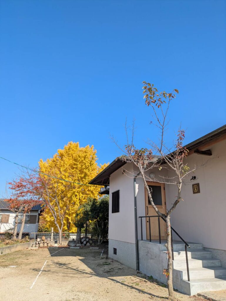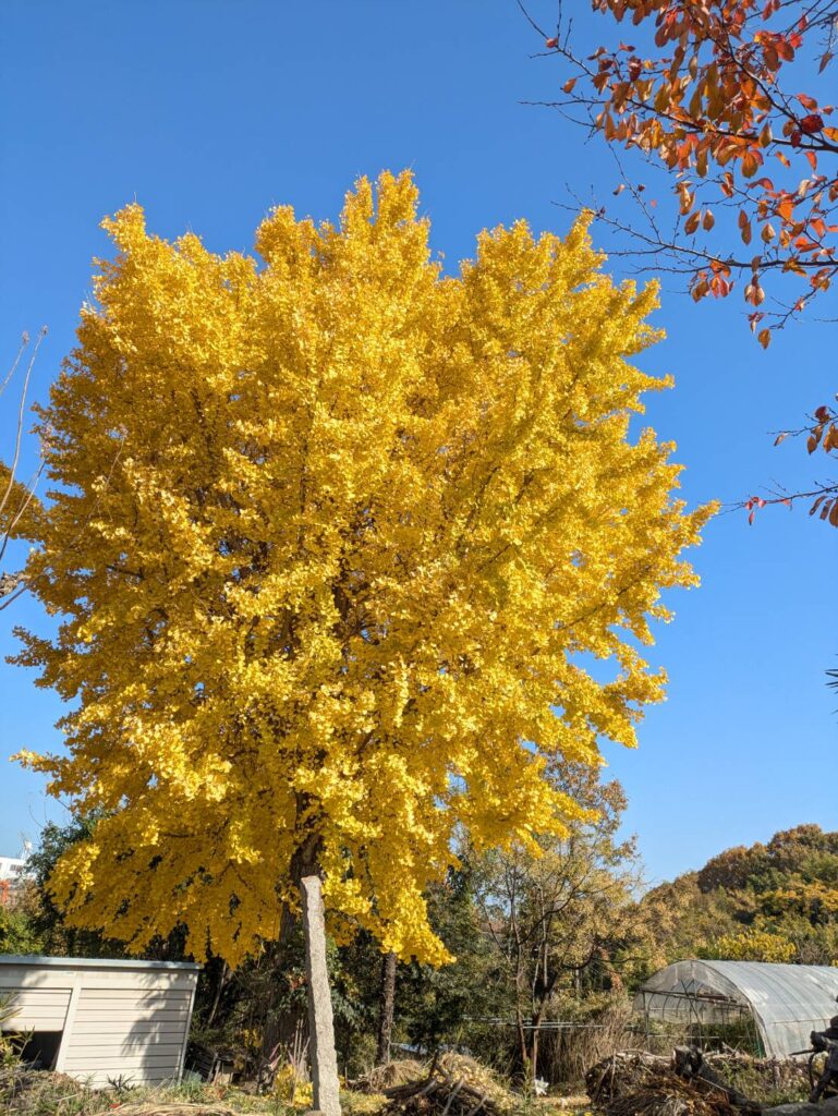 昨年の今頃はまだリノベーション工事も始まっていなかったので初めて見る黄金色の紅葉は、青空とのコントラスト美しく、、毎日眺めています。