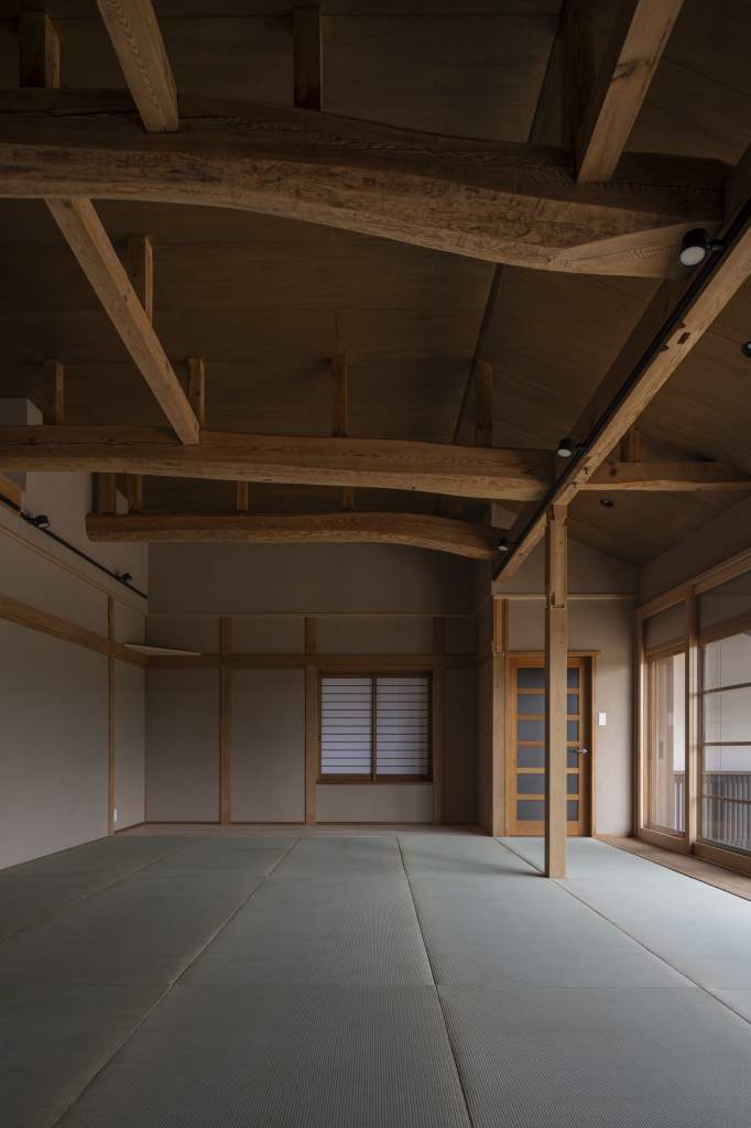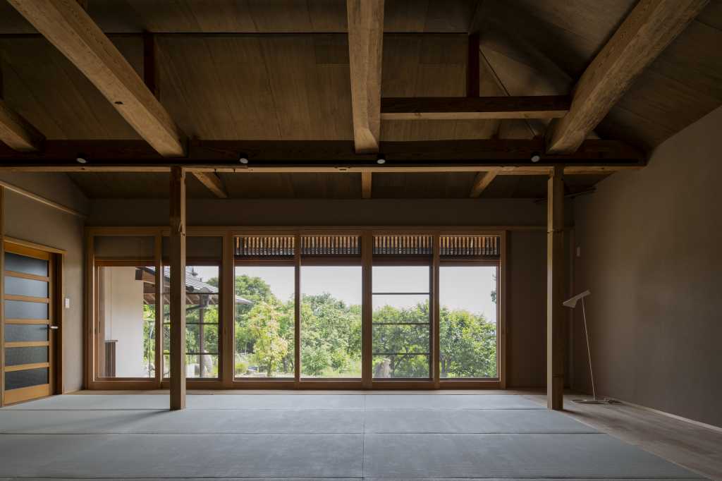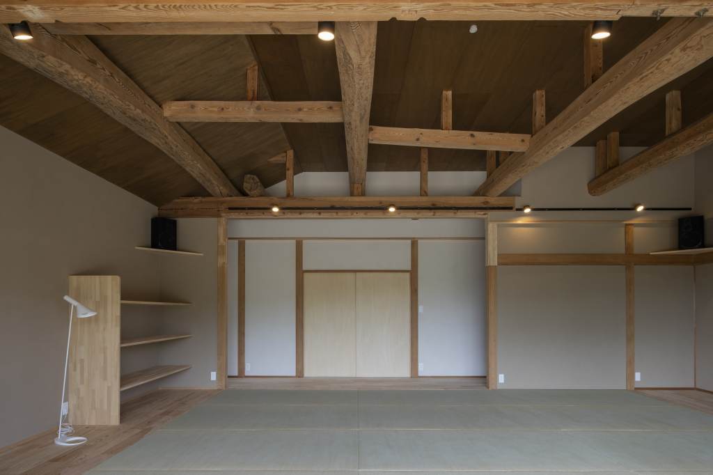 緑に囲まれた自然の風景の中に「自分に還る場(BASE)」として創られた空間は、大きな梁を眺め、無垢の床とヨガスペースには畳を敷きました。
